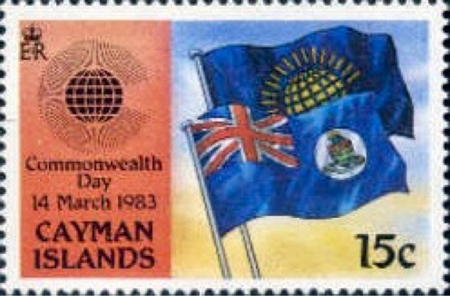 The Canadian stamp also shows the Commonwealth emblem as it was in 1983 - the flag of The Commonwealth placed the emblem at the centre of a blue field. The flag had been adopted firstly in 1976 but was modified in 2013 to a slightly simpler version. The flag has featured only rarely on any Commonwealth country stamps - it did appear in its original form on one of The Cayman Islands Commonwealth Day stamps alongside the Cayman's national flag issued in 1983.