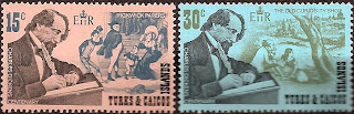 Several British colonies also issued stamps in 1970 to commemorate Dickens' death anniversary. I have recently reported that the Turks And Caicos Islands is to issue stamps to commemorate the bicentenary but as yet I have not seen an illustration of the forthcoming designs. I fear they will not match the wonderful stamps issued on 17 June 1970 which were beautifully printed by De La Rue not only by lithography but also in intaglio. Each design featured Dickens himself and a scene from one of his novels - Oliver asking for more on the 1c value, Scrooge meeting Marley's ghost (A Christmas Carol, published 1843) on the 3c value, Pickwick with Sam and Mrs. Bardell on the 15c and, on the 30c, Little Nell and her grandfather (The Old Curiosity Shop, Dickens' fourth novel, published 1840, which famously is said to have had crowds gathering at the docks in America waiting for the latest installment and shouting out "Is Little Nell Alive?" when the previous episode had left the character at Death's door; some people were less impressed by the melodrama of the story, Oscar Wilde quipped that "One must have a heart of stone to read the death of Nell without laughing).