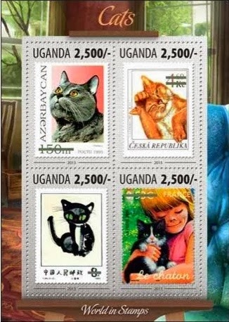 The latest Stamperija products require no comment save that they appear to have nothing to do with serious stamp collecting. The company has announced that it produced 8 sheetlets each composed of 4 different "stamps" and 8 miniature sheets on behalf of Uganda with a stated date of issue of 25 November 2013. The subjects of the sub-sets are Butterflies, Dinosaurs, Turtles, Orchids, Owls, Minerals, Domestic cats and World Wildlife. Bizarrely, the designs of each stamp depict stamps of foreign countries and the borders of the sheetlets carry the cheeky inscription "World In Stamps":-