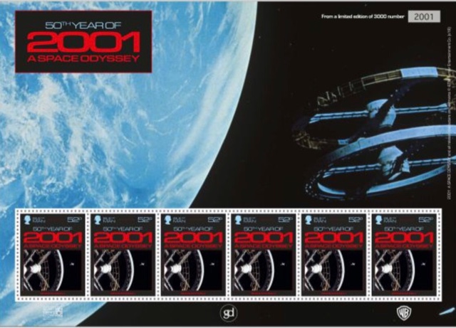 So how can a little philatelic entity cash in on this tide of science fiction/fantasy stamps without bankrupting itself by the amount of money it spends on acquiring the rights to feature such subjects? The Isle Of Man Post Office thinks it has an answer - feature a vintage film where the cost of the rights are probably considerably less. And the chosen subject - the 50th anniversary of the release of the famous 2001 A Space Odyssey which was directed by the revered if controversial Stanley Kubrick. The products for this issue are almost as numerous as those which accompanied the Royal Mail Star Wars issues but principally there are 8 basic stamps (total cost £7.99p) accompanied by 8